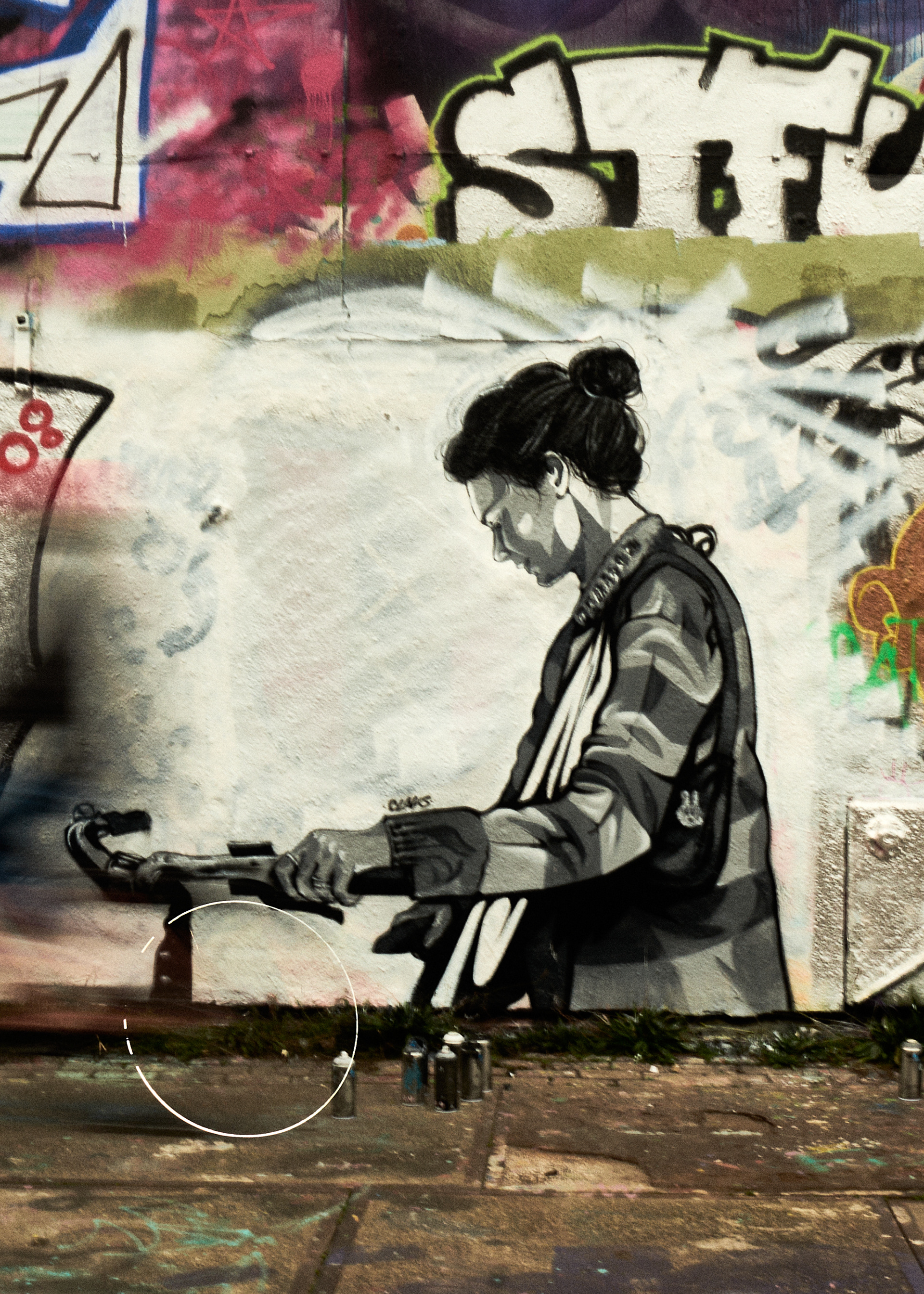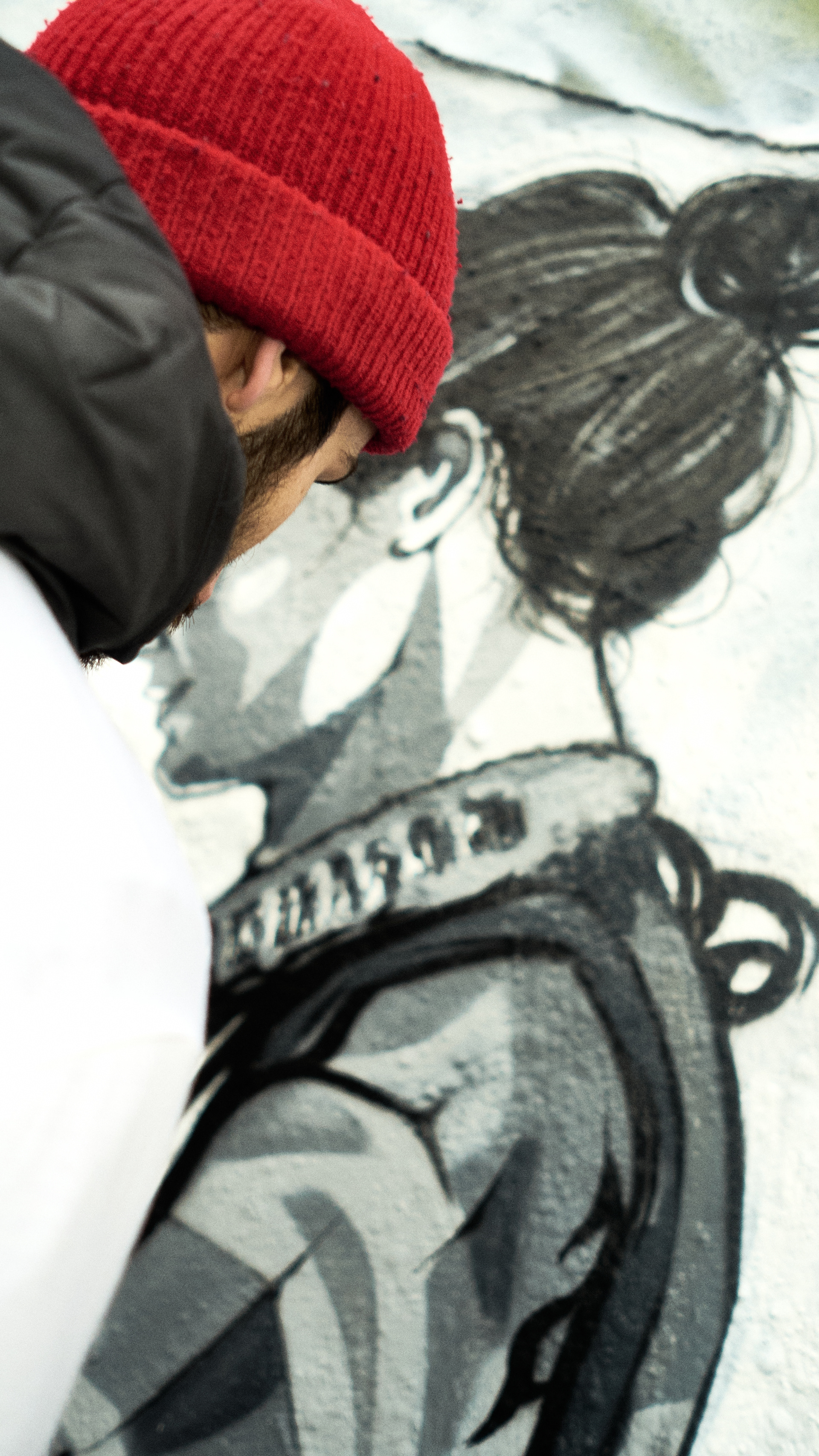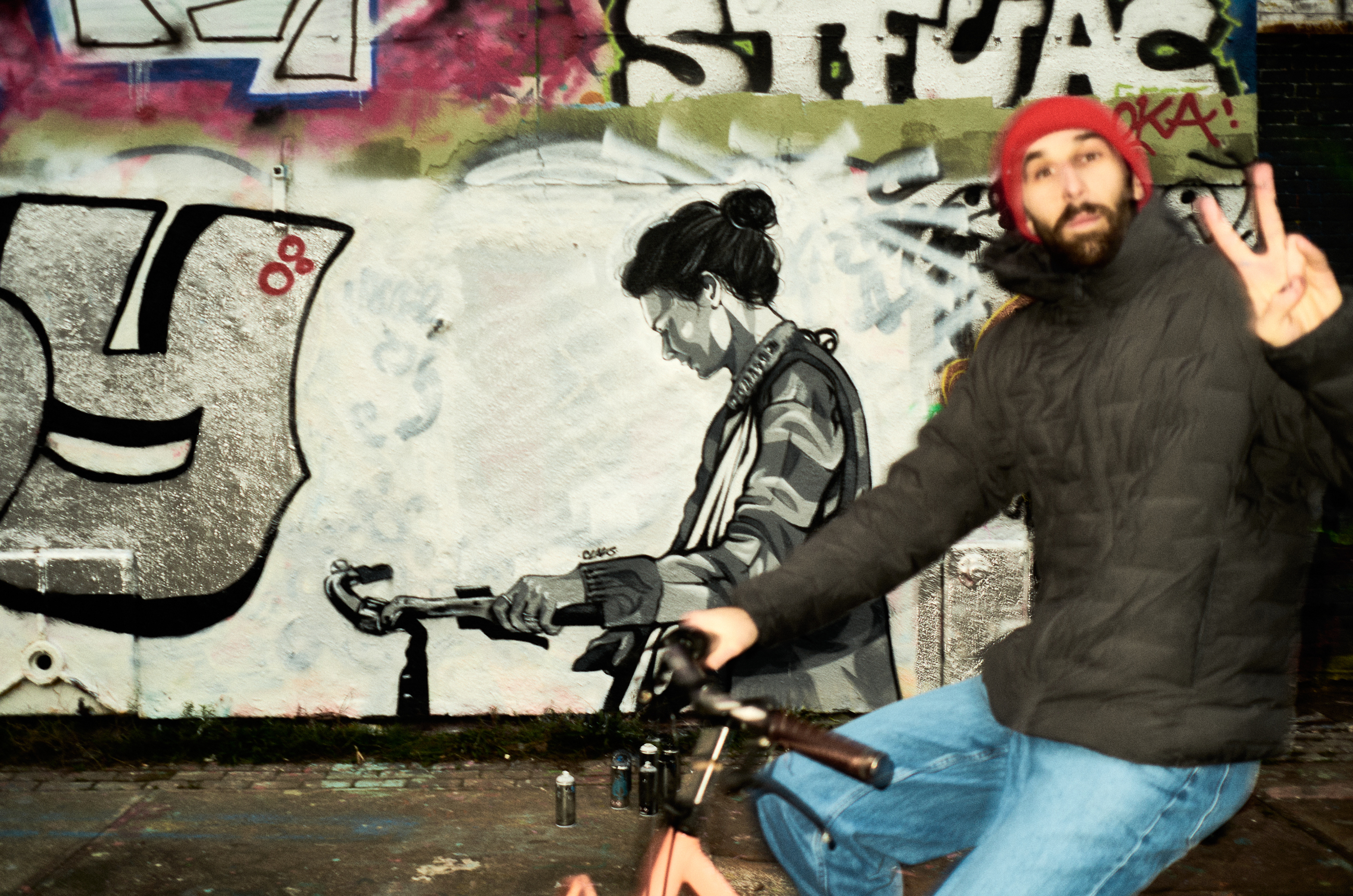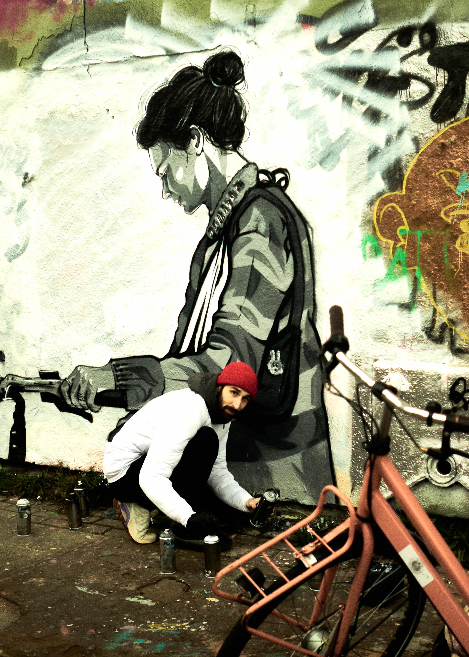 CONTEXTE : Comme à chaque fois que je découvre une ville, l’envie me ronge d’y laisser une trace. Direction le quartier NDSM à Amsterdam pour ma dernière intervention de l’année. L’exercice à l’étranger impose ses propres limites car il est impossible de faire entrer une échelle dans une valise. Cette contrainte logistique m'a forcé à travailler à hauteur d'homme et à délaisser le monumental pour me focaliser sur l'intime.