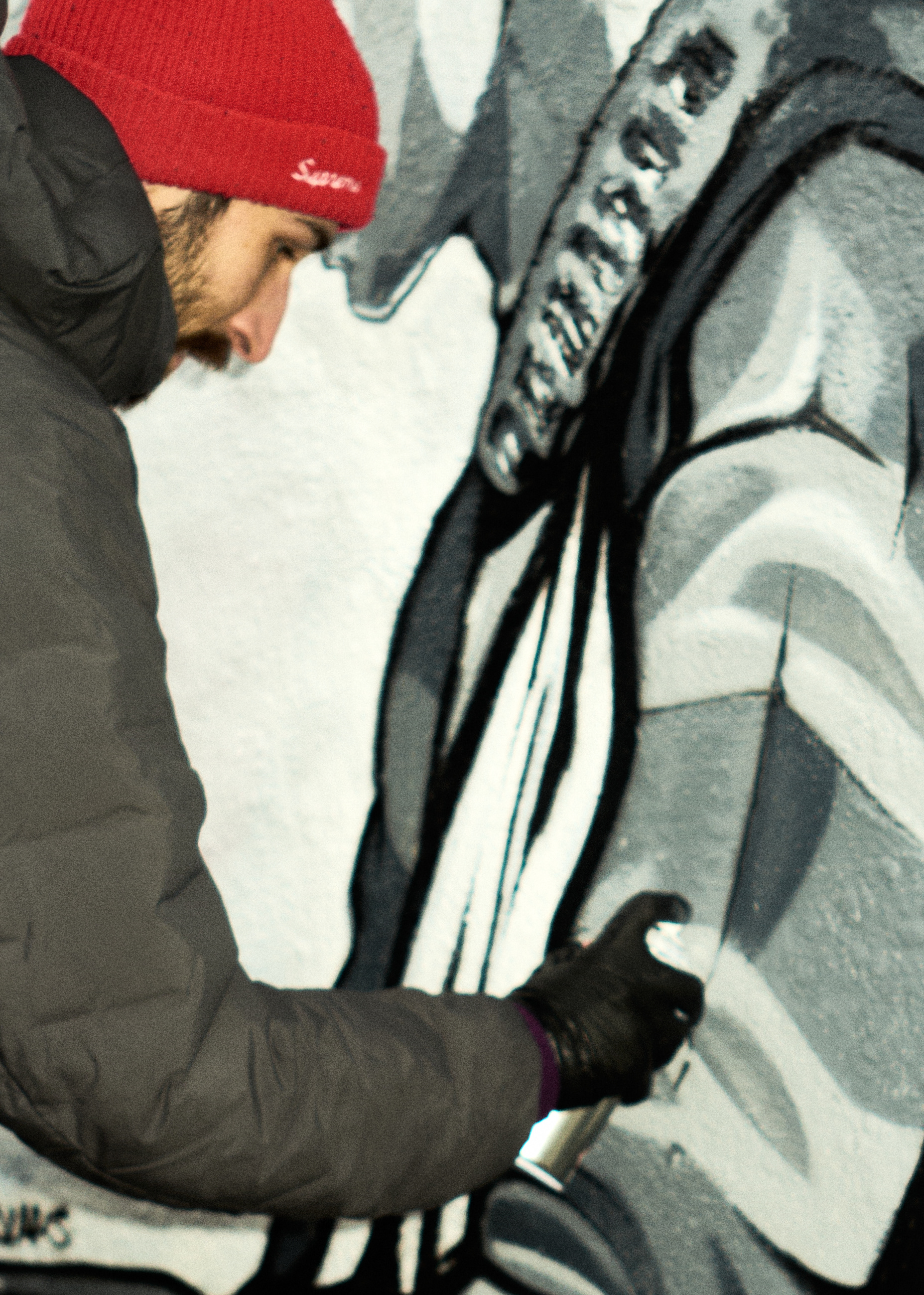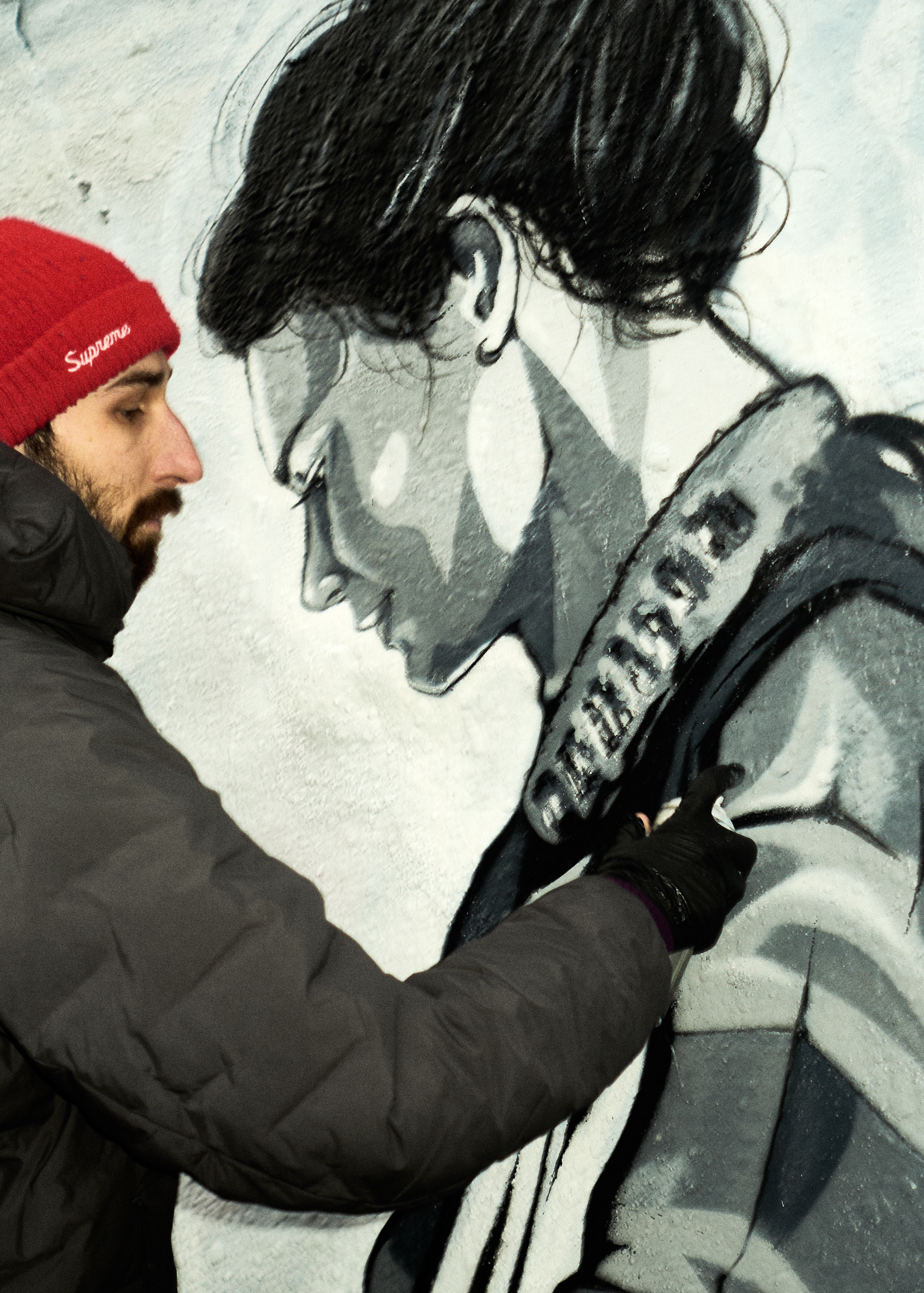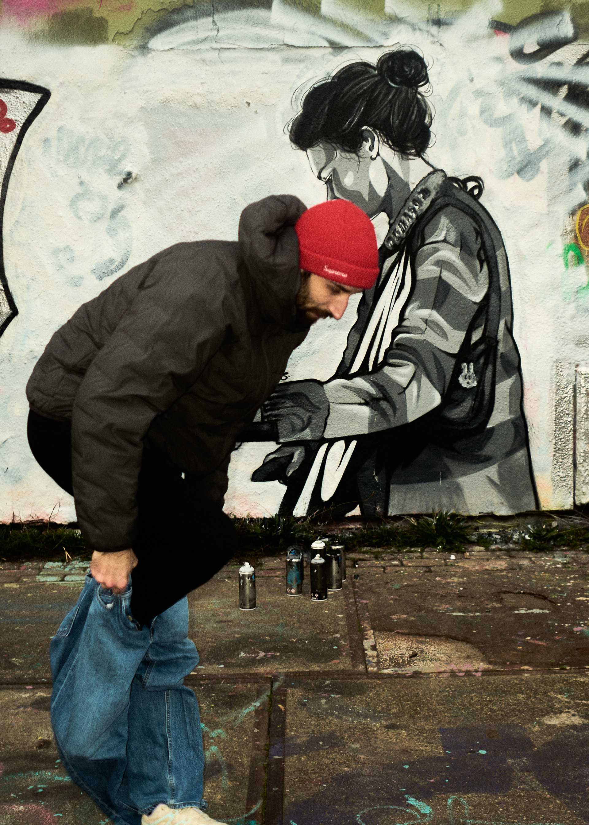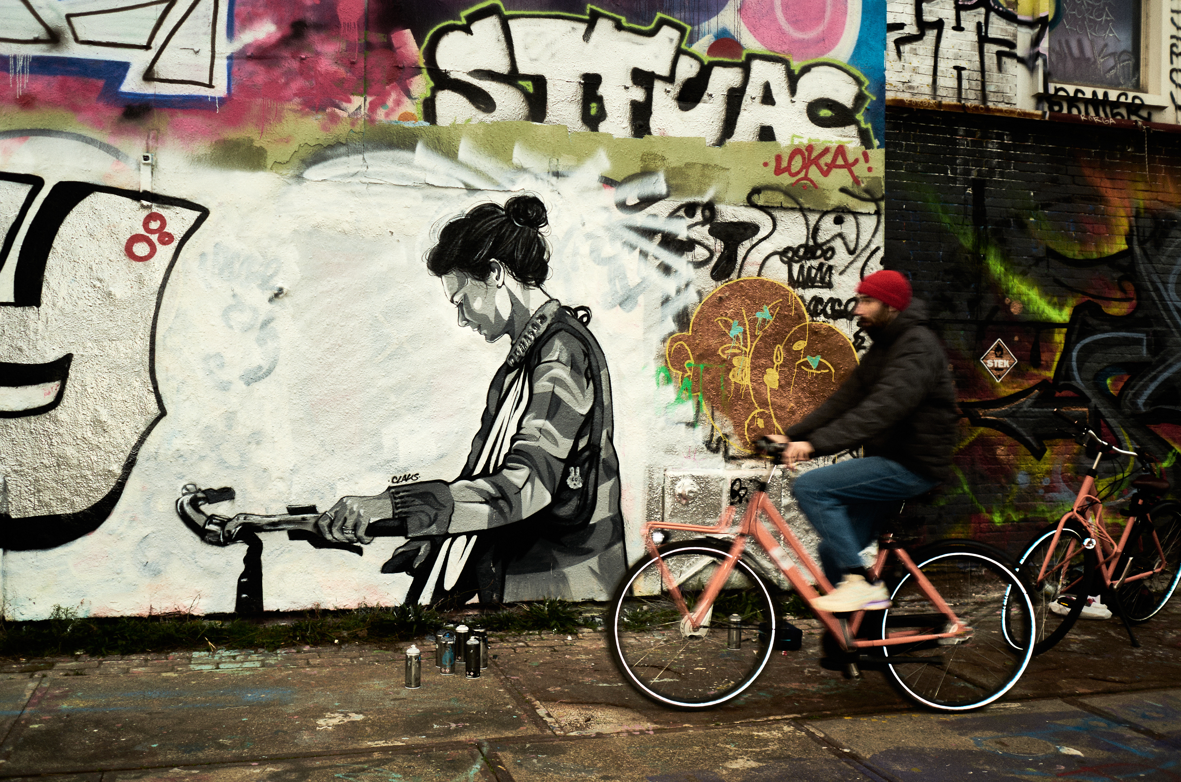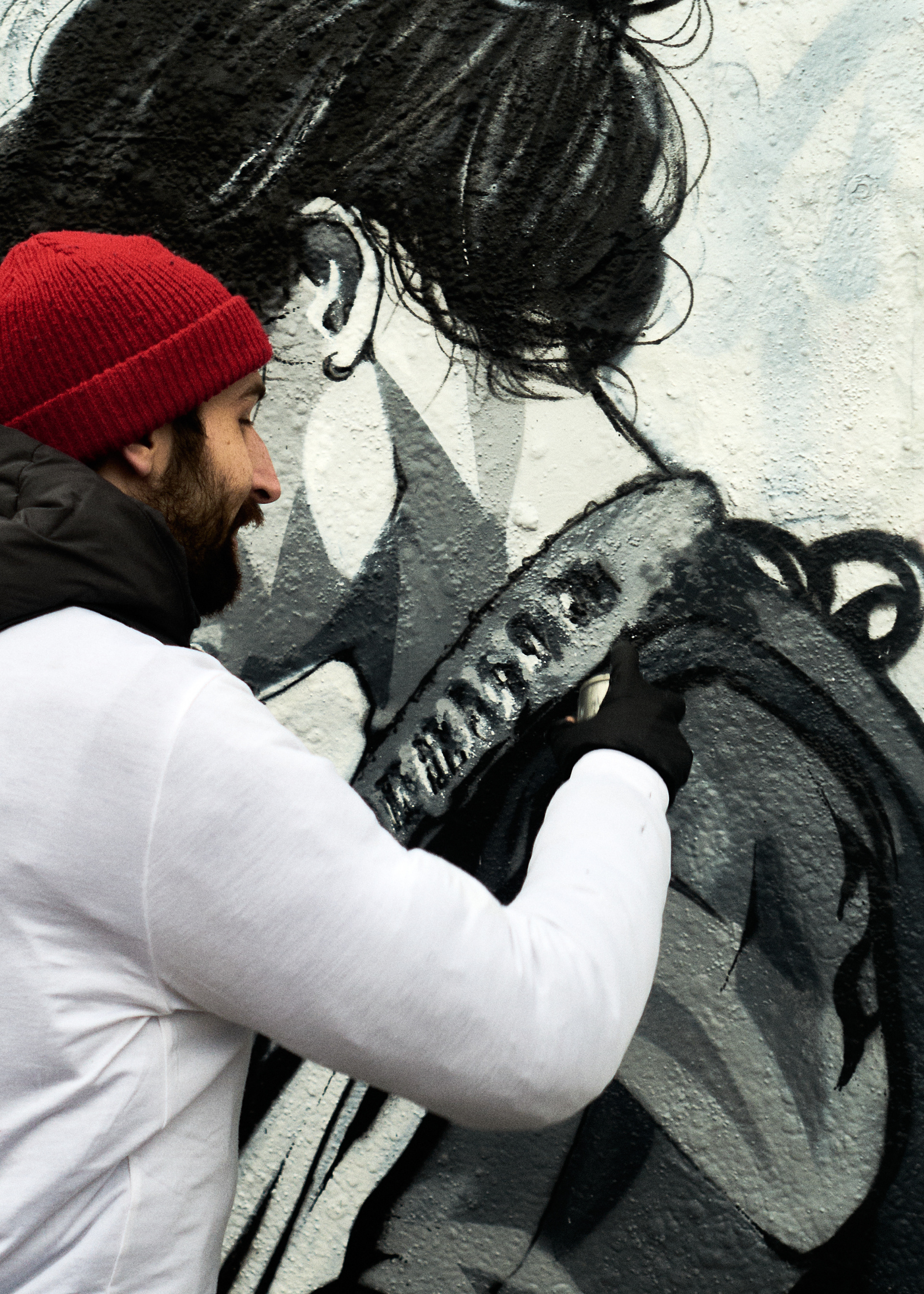 CONTEXTE : Comme à chaque fois que je découvre une ville, l’envie me ronge d’y laisser une trace. Direction le quartier NDSM à Amsterdam pour ma dernière intervention de l’année. L’exercice à l’étranger impose ses propres limites car il est impossible de faire entrer une échelle dans une valise. Cette contrainte logistique m'a forcé à travailler à hauteur d'homme et à délaisser le monumental pour me focaliser sur l'intime.
