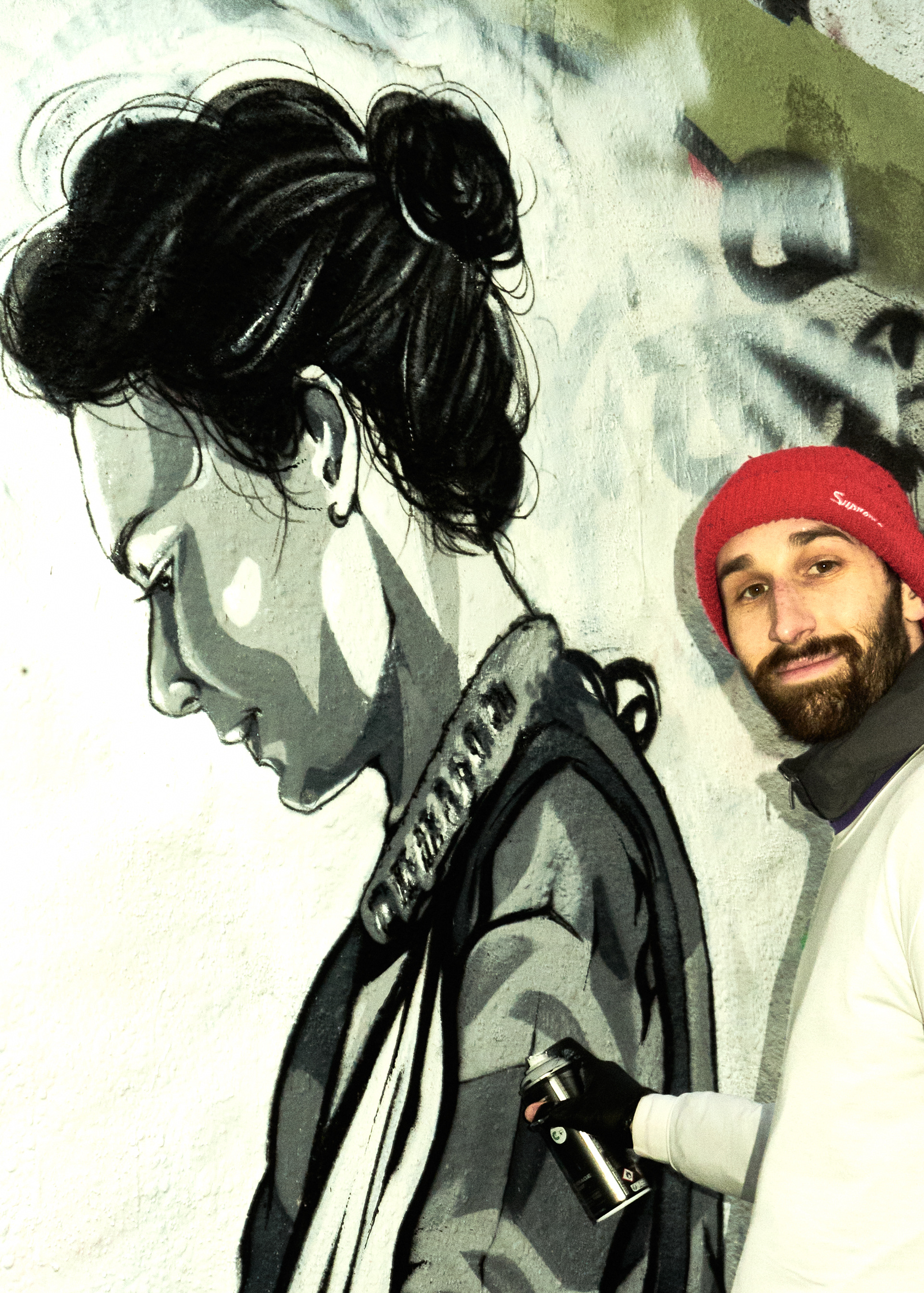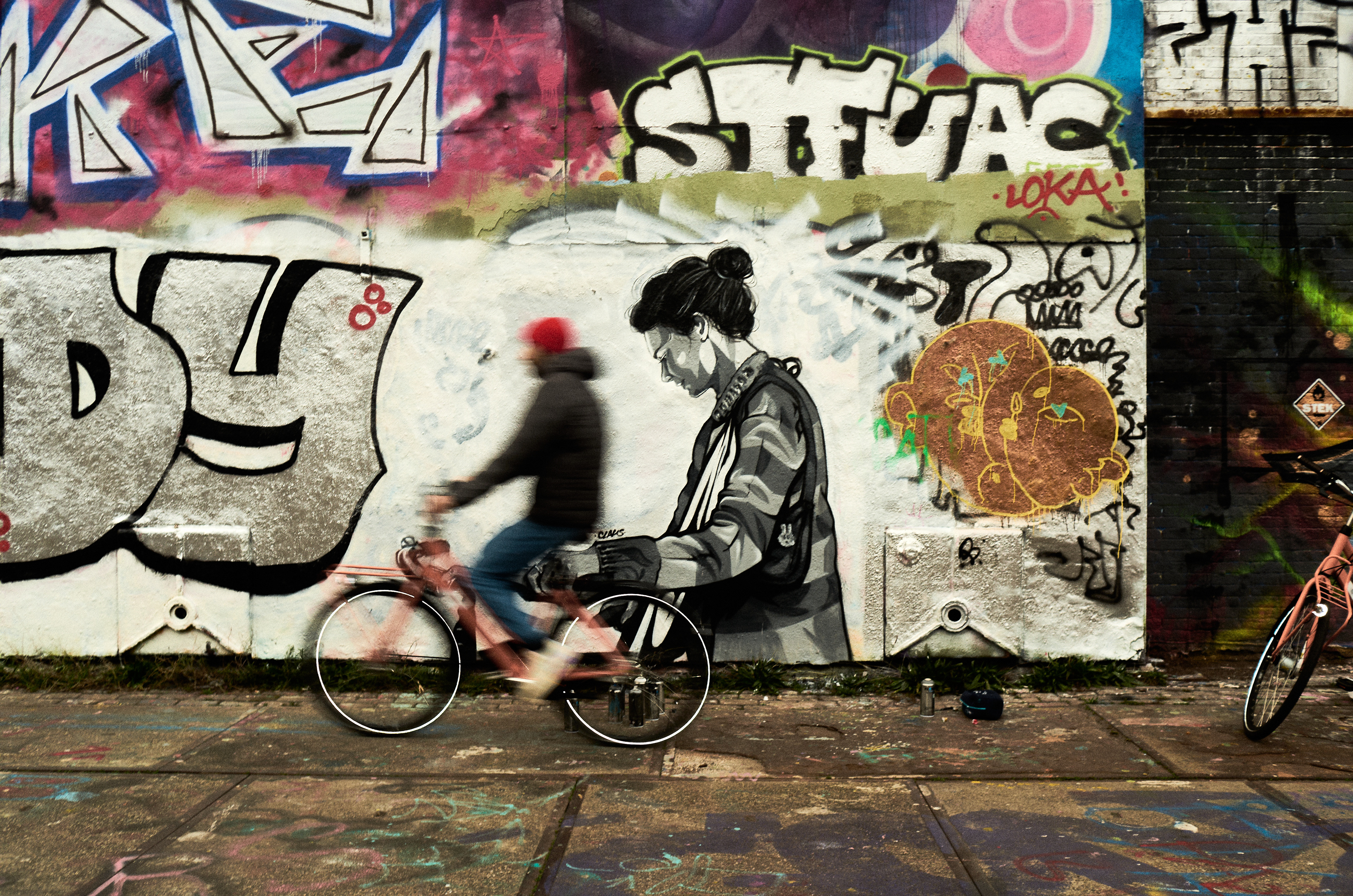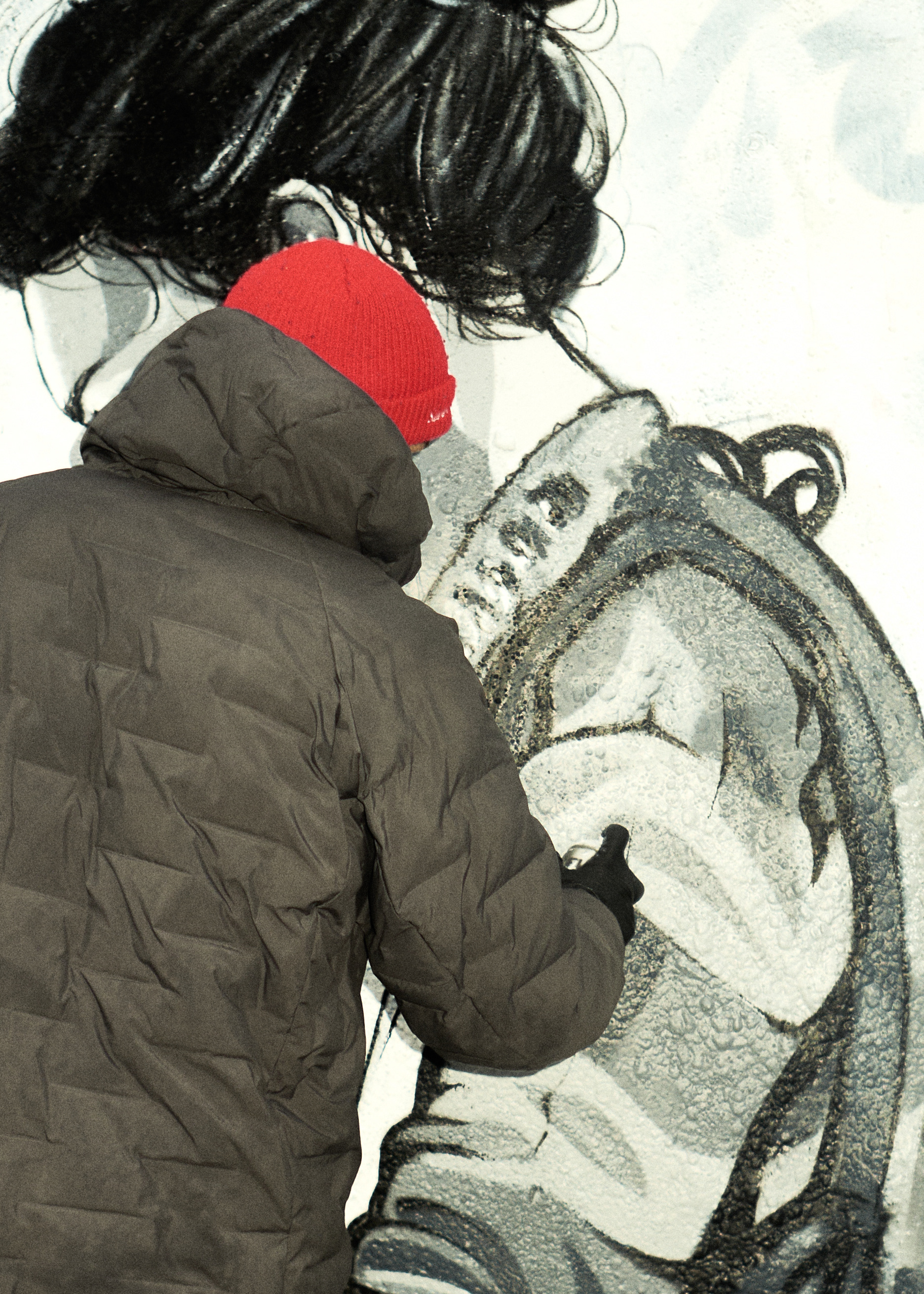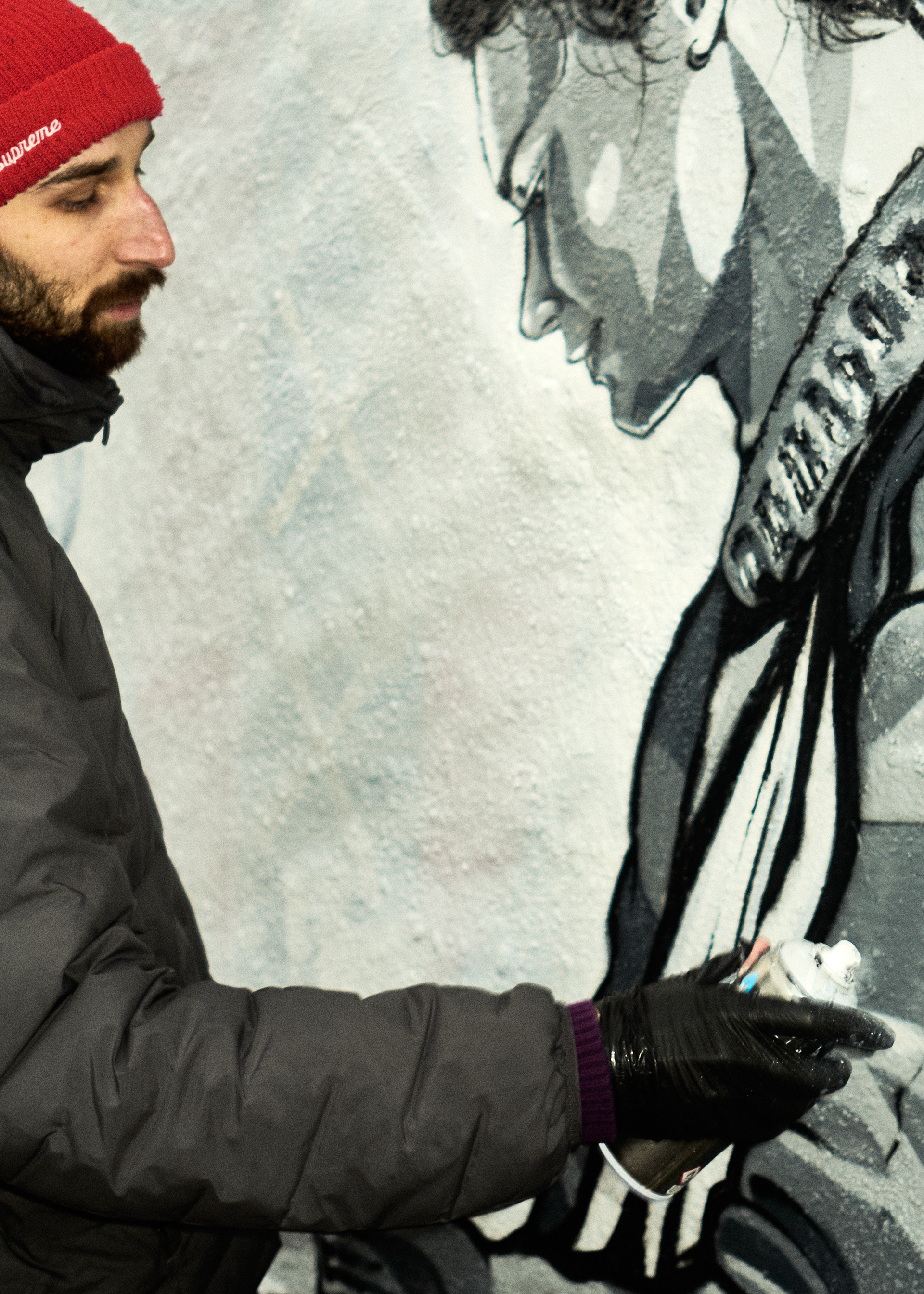 CONTEXTE : Comme à chaque fois que je découvre une ville, l’envie me ronge d’y laisser une trace. Direction le quartier NDSM à Amsterdam pour ma dernière intervention de l’année. L’exercice à l’étranger impose ses propres limites car il est impossible de faire entrer une échelle dans une valise. Cette contrainte logistique m'a forcé à travailler à hauteur d'homme et à délaisser le monumental pour me focaliser sur l'intime.